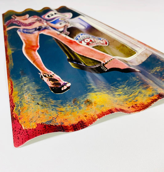 Skylt metall Mobile Gas pinup tjej i jeans.