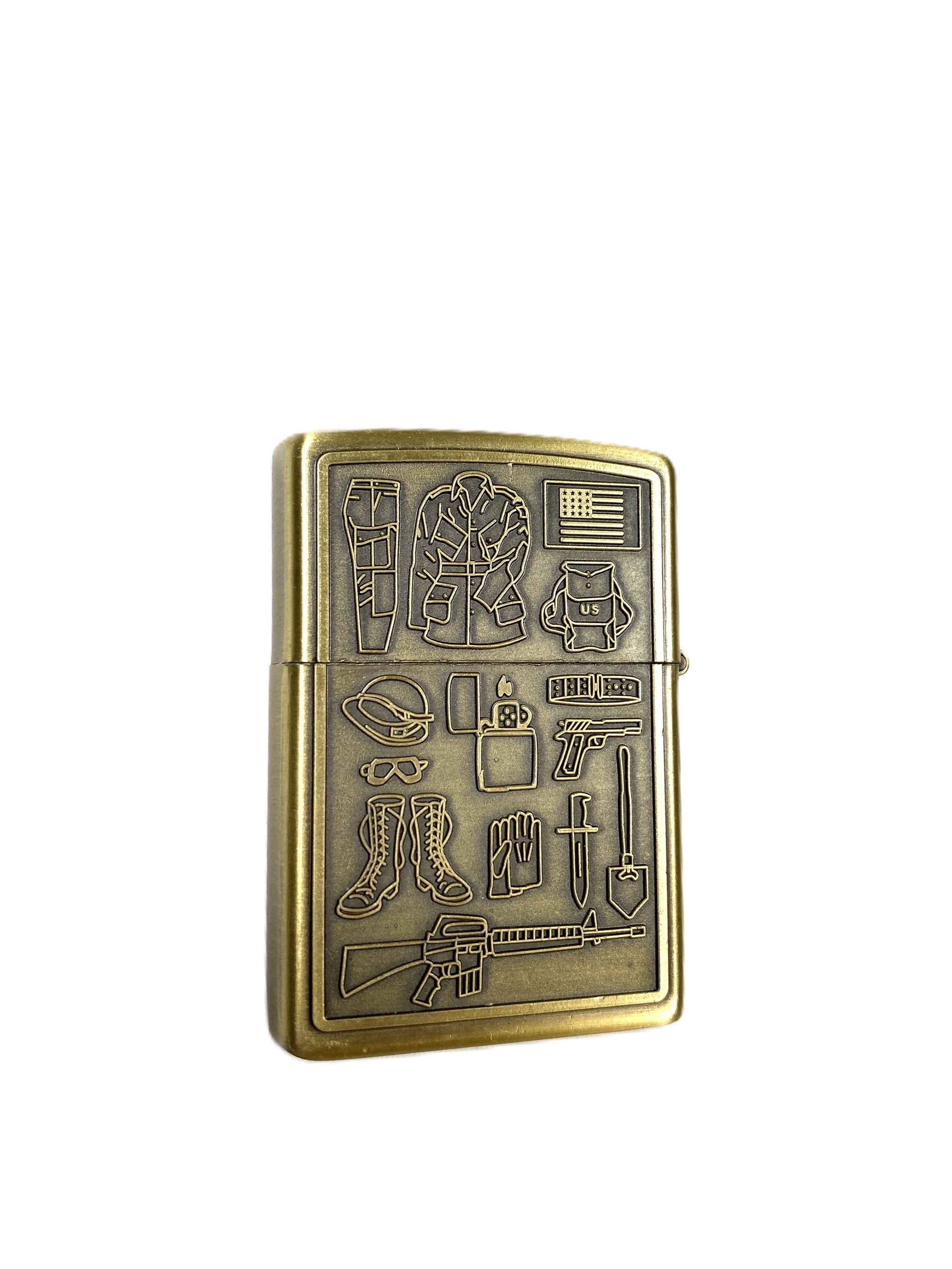 En bensintändare med releifmotiv (alltså struktur på tändaren) med motivet United states Navy.