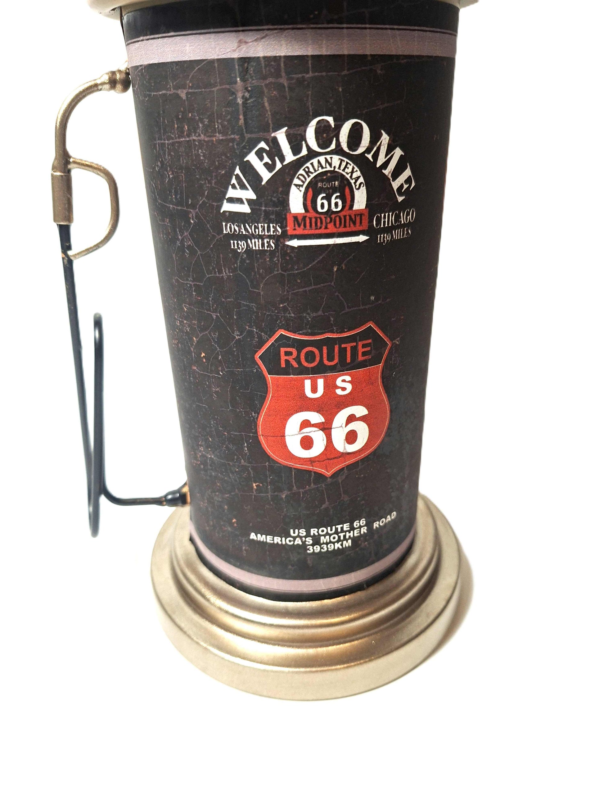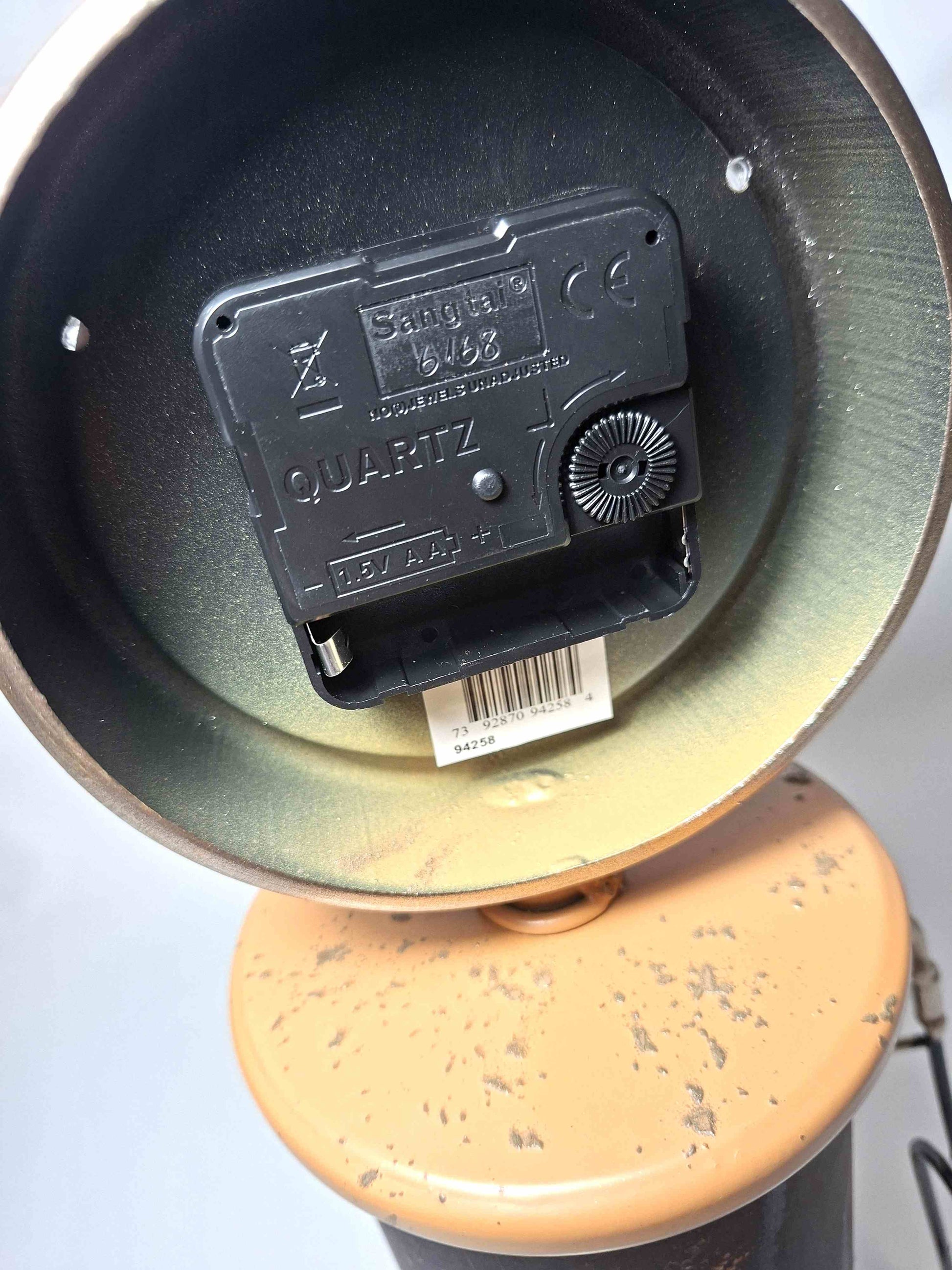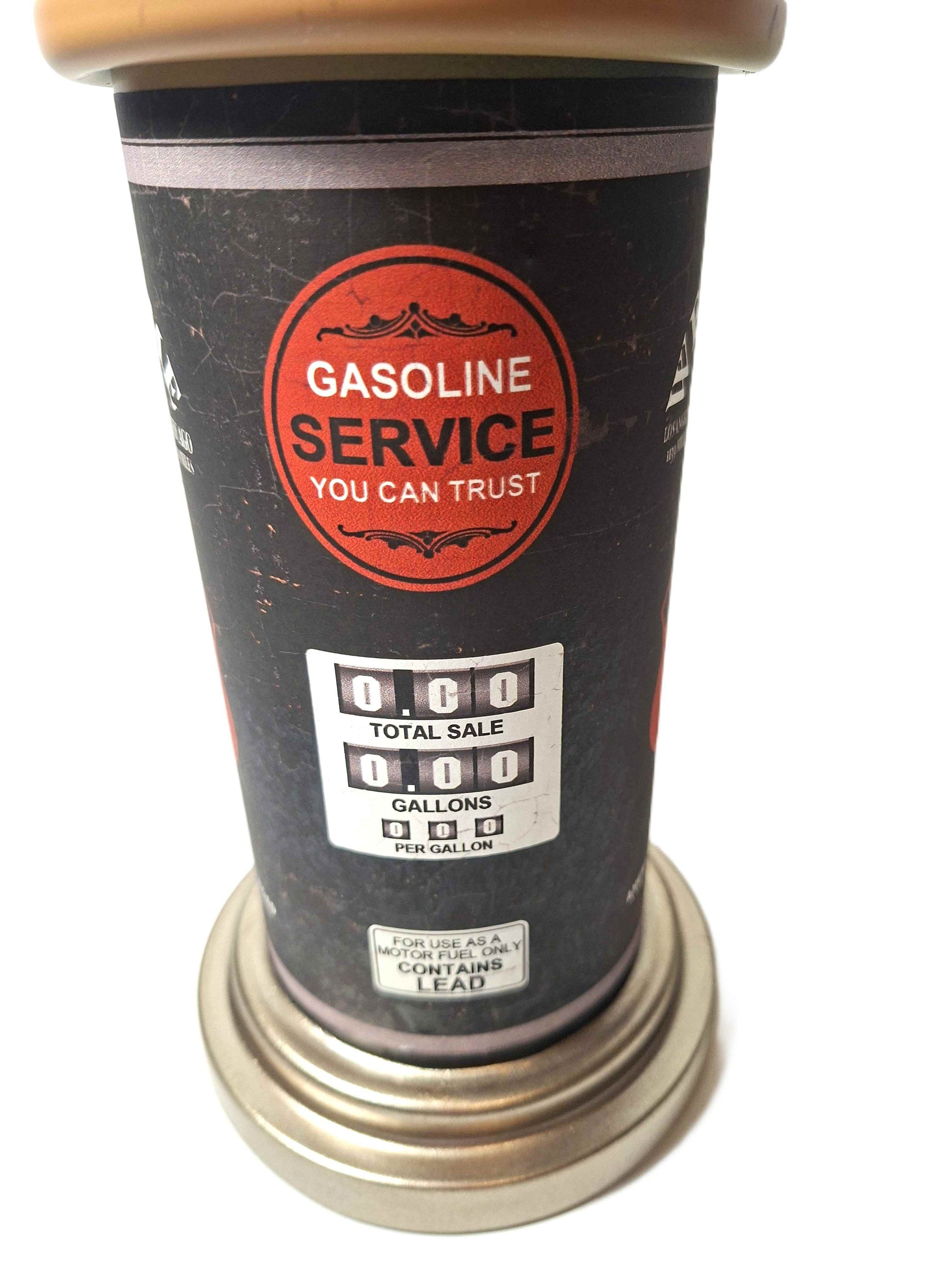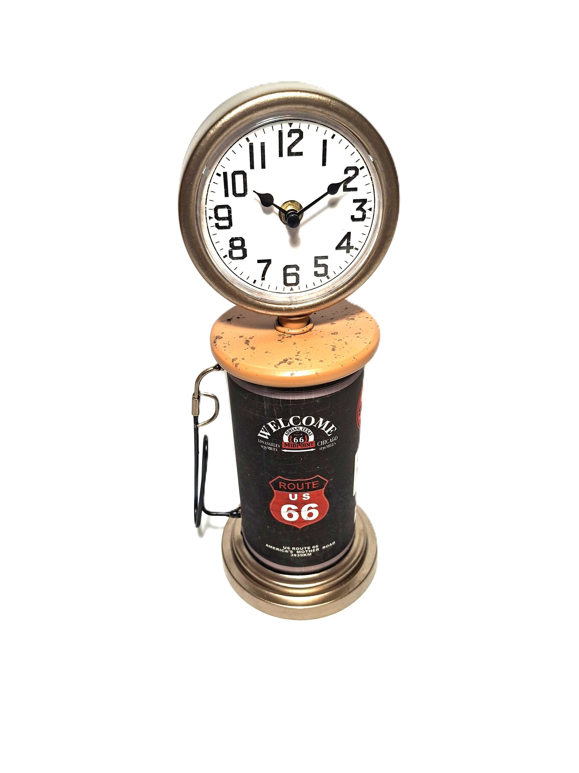 En batteridriven bordsklocka med motivet av en bensinpump i retro, klassisk stil.