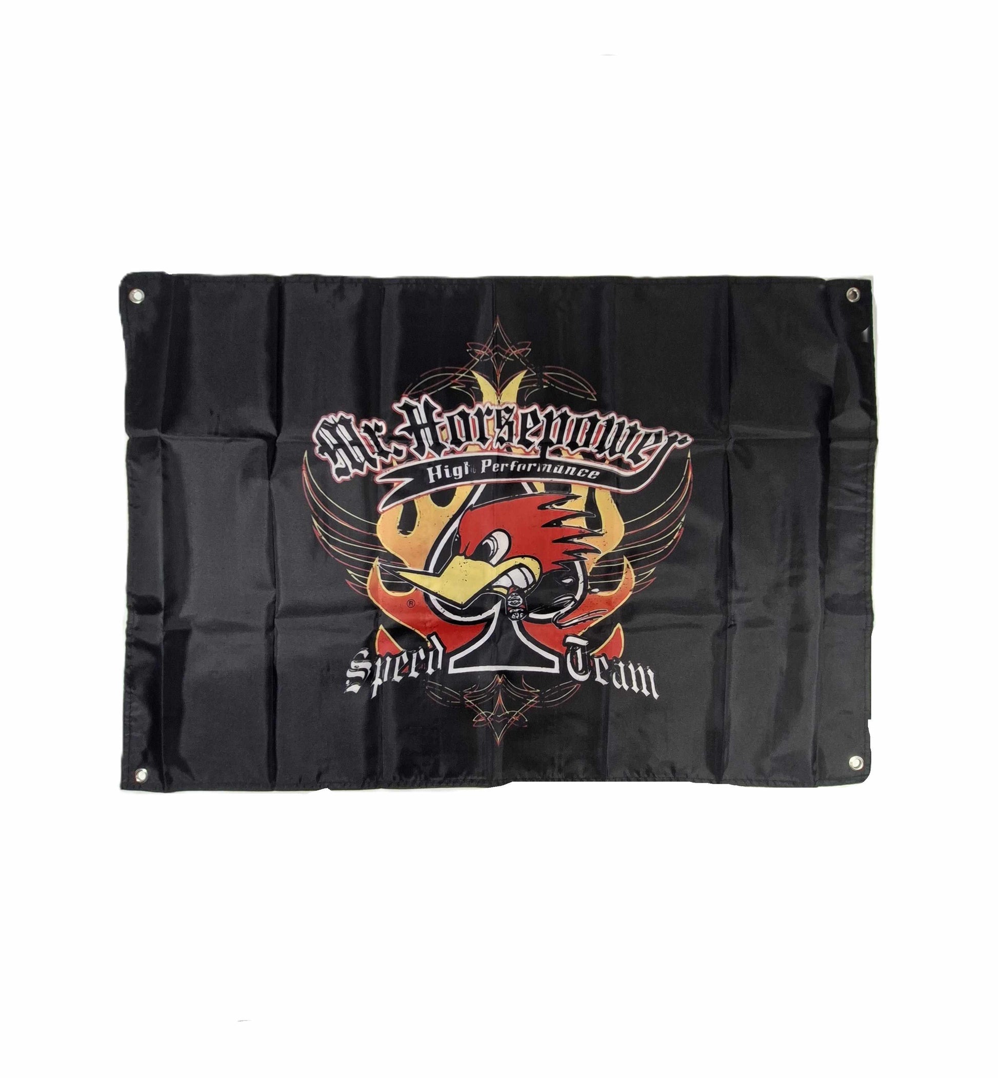 Flagga med motivet Mr. Horsepower, flaming spade