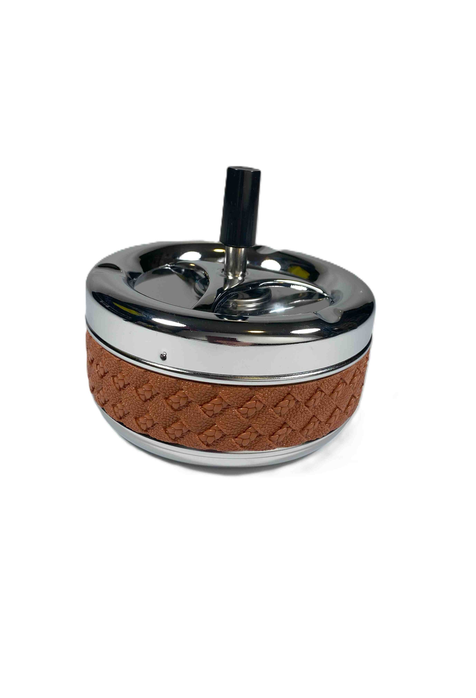 Tillverkad i stål och dekorerad med brun flätad look hela vägen runt, Denna finurliga askkopp stänger in röken och askan. När man trycker på knappen så snurrar plattan ner aska och fimp. Storleken är 13 cm i diameter.