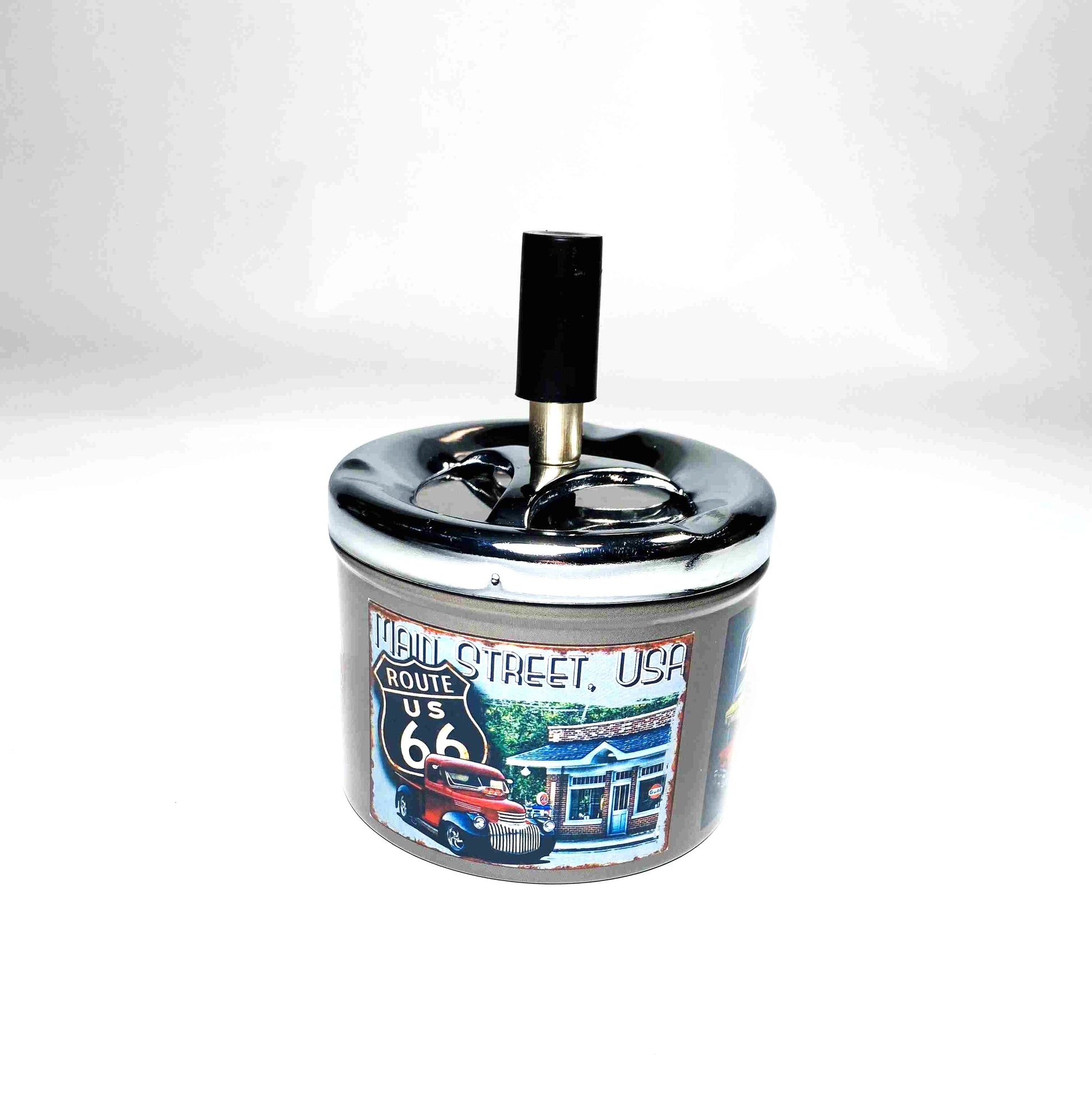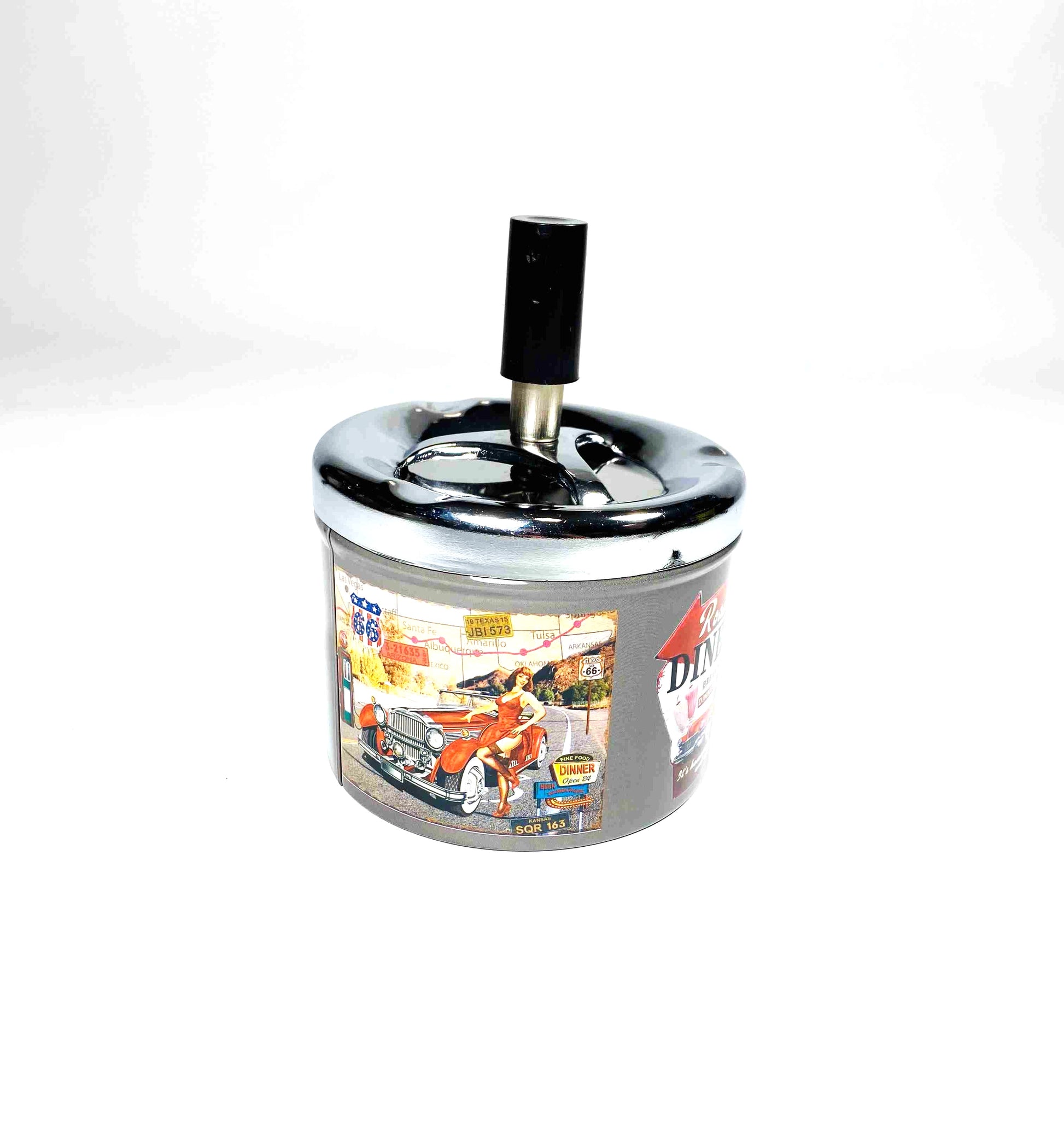 Tillverkad i stål och dekorerad med olika bilder hela vägen runt, Denna finurliga askkopp stänger in röken och askan. När man trycker på knappen så snurrar plattan ner aska och fimp. Storleken är 9 cm i diameter och behållaren är ca 11 cm hög utan knappen inräknad.